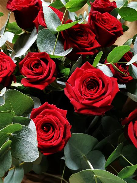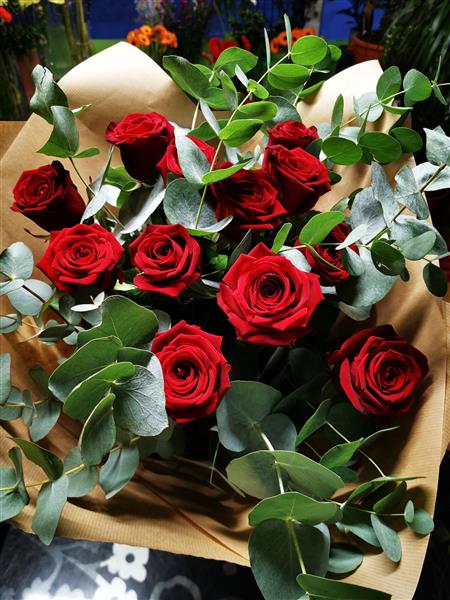 Classic aromatic eucalyptus tied with Red roses, gift wrapped in natural kraft paper and finished with a raffia bow for the perfect vintage romantic look.