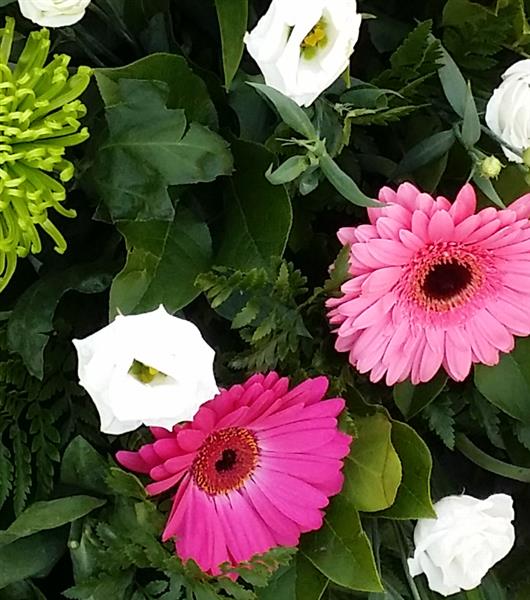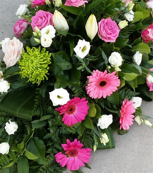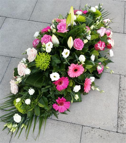 A beautiful coffin spray in lime green and pinks (standard is for 3ft)