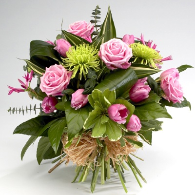 A stunning selection of zingy greens and shades of pinks with luxury foliage and finished with a raffia bow.