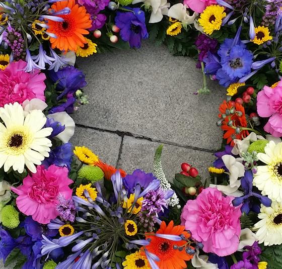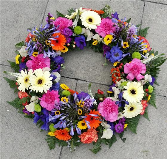 A wreath of bright mixed colours and flowers