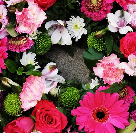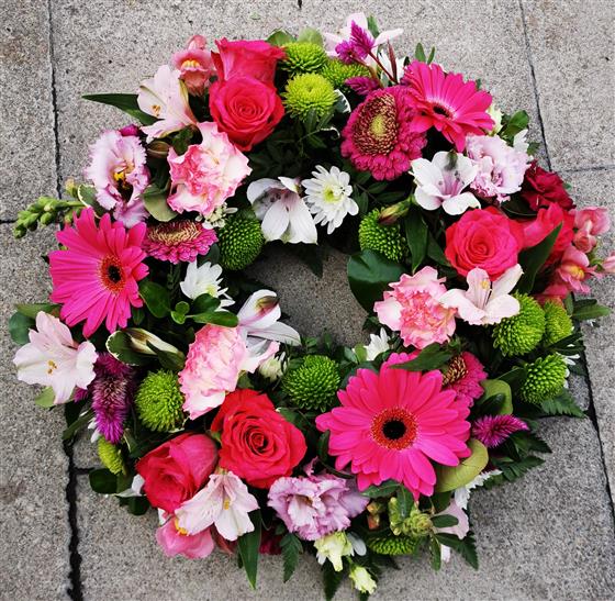 A modern wreath in groups of vibrant pinks and fresh limes.