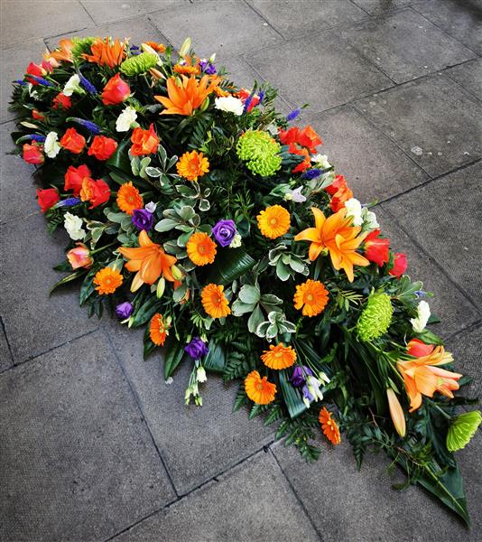 A contemporary coffin spray in shades of oranges, purples and a pop of lime