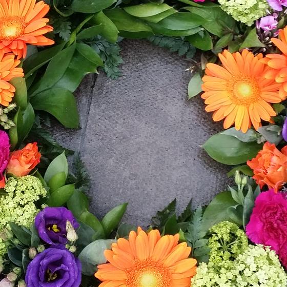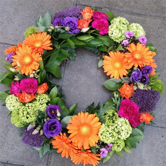A vibrant wreath in oranges, shades of purples and lime greens.