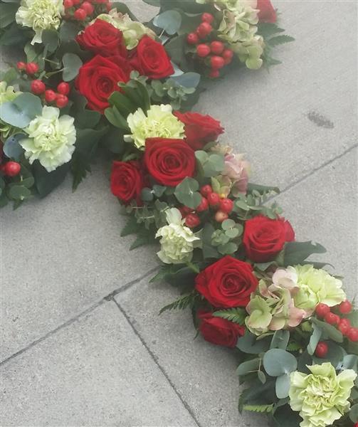 This cross is handcrafted with groups of Red Roses and Green carnations as the focal flowers.