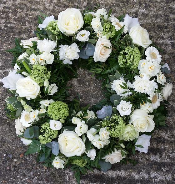 A beautiful wreath arranged in fresh whites and green. Standard price is for a 12" wreath.