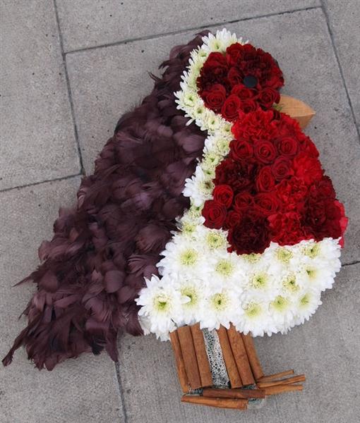 A cute Red Robin tribute with a fluffy brown feathered body, red rose and carnation breast, delicately finished with cinnamon stick feet.