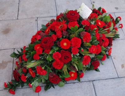 A beautiful coffin spray in shades of red. The standard price is for a 3ft spray.