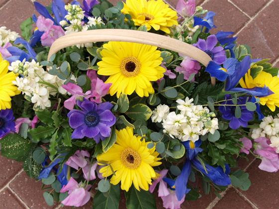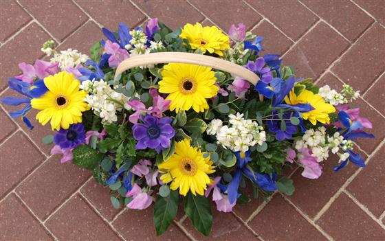 A pretty basket arrangement in purple, yellow, cream and pinks.